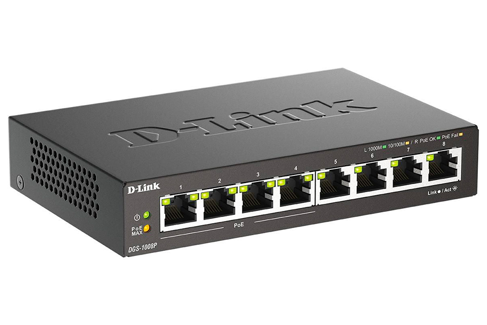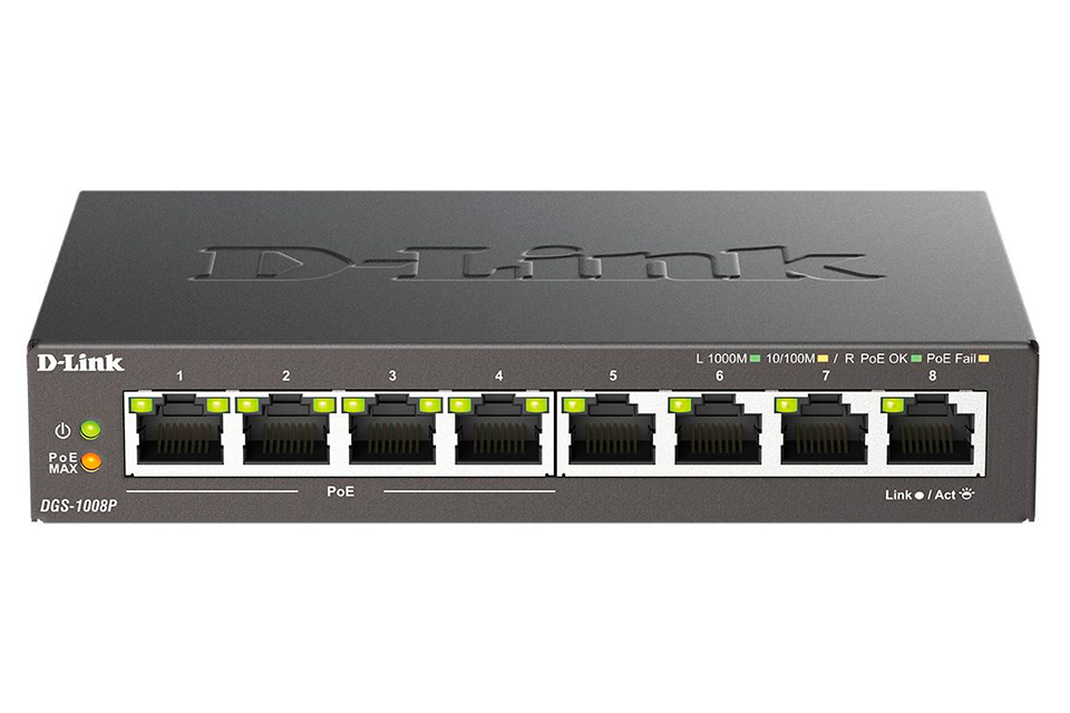 Gigabit-anslutning för småföretagD-Link® 8-portars Gigabit Ethernet PoE Switch (DGS-1008P) gör det möjligt för kontorsanvändare att enkelt ansluta och förse Power over Ethernet (PoE)-enheter som IP-kameror, IP-telefoner och trådlösa åtkomstpunkter (AP:er) ) till ett nätverk. De 8 Gigabit-portarna ger anslutningsmöjligheter för enheter och applikationer som kräver höghastighetsnätverksåtkomst och minskar flaskhalsar som kan avbryta kommunikationen. DGS-1008P ger också möjlighet att lägga till ytterligare Ethernet-enheter som datorer, skrivare och Network Attached Storage (NAS) till ett nätverk. Denna kompakta PoE-switch fungerar tyst, vilket gör den idealisk för användning i praktiskt taget alla rum eller kontor.Power Over Ethernet (PoE)De fyra första portarna på DGS-1008P stöder IEEE 802.3af PoE-protokollet. Var och en av dessa fyra portar kan leverera upp till 15,4 watt för en total PoE-budget på 52 watt, vilket gör att användare kan ansluta en IEEE 802.3af-kompatibel enhet till DGS-1008P som inte kräver någon extra ström. Använd PoE för applikationer som är långt från eluttag eller när du vill minimera röran med extra kablar.Produkttester och länkar