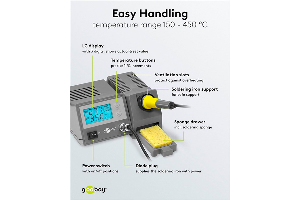 Höjdpunkter:• Digital lödstation med stor upplyst LCD skärm• Exakt temperaturinställning i 1 °C intervaller • Snabb uppvärmning med 48 W effekt • Idealisk för elektronik, modellbygge och pyrografi • Enkel byte av lödspets med låssystem • Stabil och säker konstruktion med isolerat hölje Precision och kontroll för lödarbeten:Den digitala lödstationen är utvecklad för dig som kräver hög precision och full kontroll vid alla typer av lödarbeten. Den stora och tydliga LCD skärmen på 60 x 30 mm gör det enkelt att läsa av och justera temperaturen exakt, även vid mer krävande uppgifter. Temperaturen ställs in via upp och ner knapparna i exakta steg om 1 °C, vilket ger optimal kontroll vid arbete med känsliga komponenter som kretskort och elektronik. Med en effekt på 48 W har lödkolven en kort uppvärmningstid och når cirka 330 °C på runt 90 sekunder, så du snabbt kan komma igång utan onödig väntetid.Mångsidig lösning för hobby och professionell användning:Den kompakta och lätta konstruktionen gör lödstationen lämplig för både hobbybruk och mer precisionskrävande arbeten. Den är idealisk för modellbygge, elektronikarbete och pyrografi, där stabil temperatur och god ergonomi är avgörande. Det smarta låssystemet gör det snabbt och enkelt att byta lödspetsar, så du lätt kan anpassa verktyget efter olika arbetsuppgifter. Den medföljande lödsvampen gör det enkelt att rengöra lödspetsen under arbetets gång, vilket säkerställer snygga och jämna lödresultat varje gång. Det isolerade höljet och den stabila basen bidrar till hög säkerhet vid användning.Specifications:• Effekt: 48 W• Ingångsspänning: 220 - 240 V AC • Temperaturområde: 150 °C till 450 °C • Uppvärmningstid: Cirka 330 °C på 90 sekunder • Display: LCD, 60 x 30 mm • Färg: Grå och gul • Längd: 185 mm • Bredd: 100 mm • Höjd: 165 mm • Vikt: 2000 g • Utbytbara lödspetsar: Kompatibel med typ 51073 • Medföljer: Lödsvamp Produkttester och länkarHär kan du se hur andra kunder har bedömt varan med karaktär och möjligen gjort en bedömning. Medelbetyg (5,0):