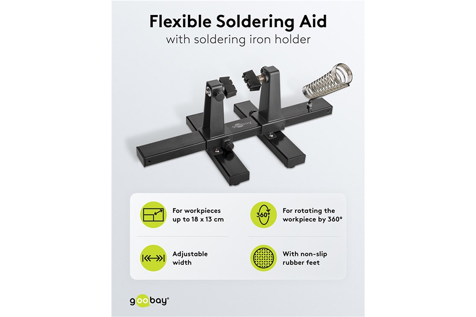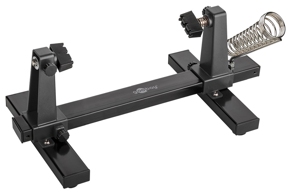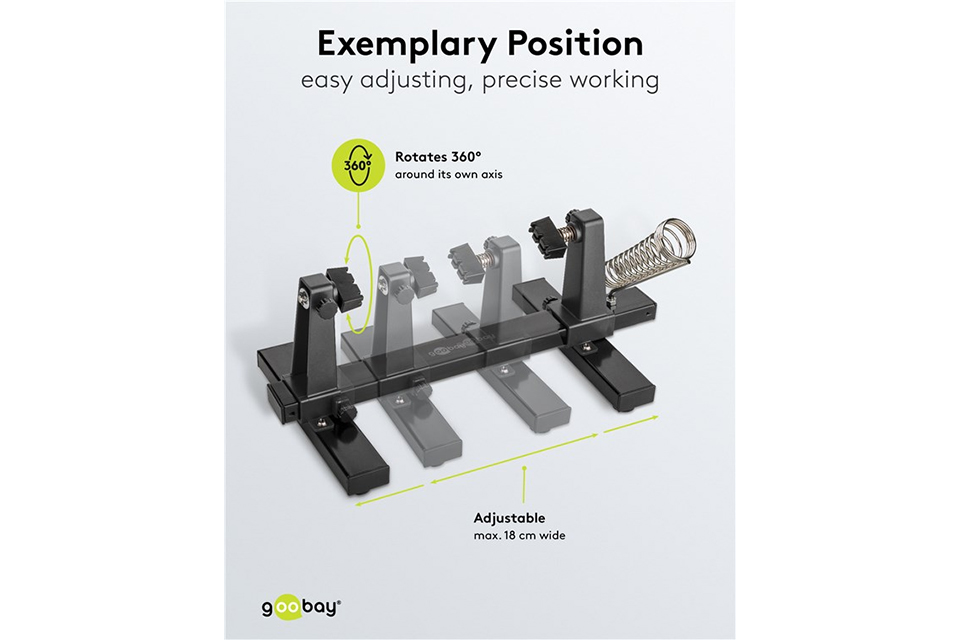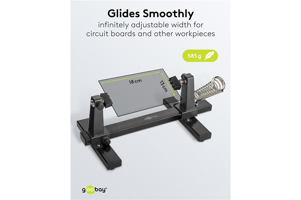 Hållaren är lämplig för kretskort upp till 18 cm breda, och arbetsstycken kan roteras 360 grader om de är upp till 13 cm höga. Klämarmarna glider lätt på mittskenan och låses med en skruv. Med olika bredder på klämkäkarna kan hållaren anpassas till många typer av arbetsstycken. Fjädermekanismen säkerställer ett fast grepp utan risk för skador.