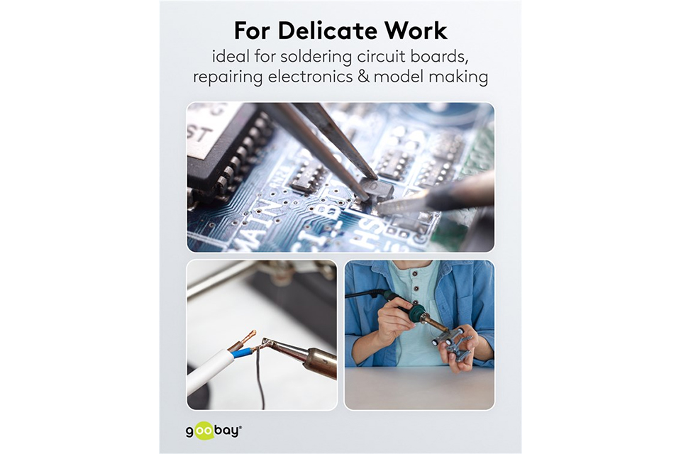 De halkfria gummifötterna ger en stabil bas, så att hållaren står stadigt även under precisionsarbete. Den robusta konstruktionen och smarta designen gör den till ett oumbärligt verktyg vid lödning, modellbygge, smyckesreparation och andra hobbyprojekt.