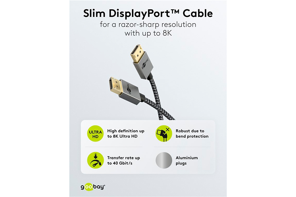 Höjdpunkter:• Stöder upp till 8K vid 120 Hz och 4K vid 240 Hz• Ultraslank kabel med extra korta kontakter • Liten böjningsradie för installation i trånga utrymmen • Överföringshastighet upp till 40 Gbit/s • Perfekt för gaming, VR och multimonitorlösningar • Elegant metallback i Sharkskin Grey • Textilklädd kabel skyddar känsliga ytor Slank design för högpresterande bildkvalitet:Denna ultrasmala DisplayPort kabel levererar maximal prestanda utan att ta upp onödigt mycket plats. Med en överföringshastighet på upp till 40 Gbit/s och stöd för upplösningar upp till 8K vid 120 Hz eller 4K vid 240 Hz garanteras kristallklar bildkvalitet och mjuka rörelser. Detta gör den perfekt för gaming, VR och multimonitorlösningar där bildkvalitet och snabb respons är avgörande. Kombinationen av extra korta kontakter och en minimal böjningsradie gör kabeln idealisk för trånga utrymmen, till exempel bakom TV-apparater, skärmar eller möbler nära väggar.Hållbar och stilren kabel för moderna installationer:Som en del av Goobay Plus-serien imponerar kabeln med sin robusta och eleganta metallback i Sharkskin Grey. Guldpläterade kontakter och en textilklädd yta ger inte bara ett premiumutseende, utan skyddar också mot slitage och repor. Den dubbla aluminiumskärmningen säkerställer stabil signalöverföring utan störningar, vilket gör kabeln pålitlig i alla miljöer. Med stöd för daisy chaining kan du enkelt koppla ihop flera skärmar via en enda kabel och skapa en professionell eller underhållningsfokuserad setup utan kompromisser.Specifications:• Stödda upplösningar: Upp till 8K/120 Hz DSC och 4K/240 Hz DSC• Överföringshastighet: Upp till 40 Gbit/s • Överföringsläge: UHBR10 • Kontakter: Guldpläterade kontakter, aluminiumhölje • Kabeltyp: Slank rund kabel med textilklädsel • Kabeldiameter: Ca. 4,3 mm • Inre ledarmaterial: Koppar (CU) • Skärmning: Dubbel aluminiumfolie • Kinkskydd: Integrerat