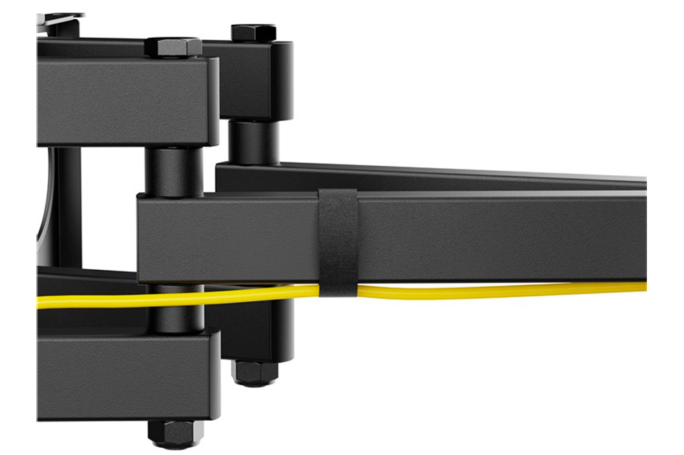 När fästet är helt infällt uppnås ett väggavstånd på endast 6,1 cm, vilket ger en snygg och diskret installation där TV:n inte sticker ut i rummet. De medföljande kardborrebanden gör det enkelt att dölja kablar längs armarna, vilket ger en prydlig installation utan kabeltrassel. Detta gör fästet till en både praktisk och stilren lösning i alla hem.