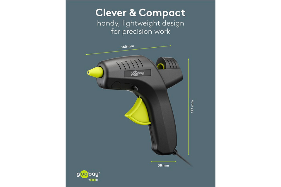 Med en arbetstemperatur på upp till 200 °C och en 1 meter lång kabel med Eurokontakt passar den perfekt till de flesta eluttag. Den fungerar med en spänningsförsörjning på 110–240 V, vilket gör den flexibel för användning i olika miljöer. Förpackad i en praktisk detaljlåda och levererad med två 11 mm limstavar, redo att användas direkt.